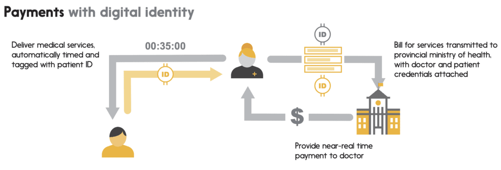 As our patient leaves the doctor, the office automatically submits a services bill to the provincial ministry of health, detailing the services provided, the time required to provide them, and including the patientโs identity to fully authenticate the invoice. Authenticated real-time invoices substantially reduce the risk of billing error and billing fraud, reducing overhead for medical practices and for the ministry of health. Whatโs more, without having to allow significant time for billings to be reconciled between the two parties, it may become possible over the longer term for ministries to remit payments to doctors on a near-real-time basis.