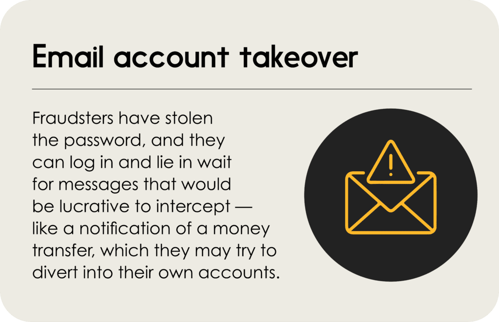 Many email accounts are compromised without the owner knowing it. That means fraudsters have stolen the password, and they can log in and lay in wait for messages that would be lucrative to intercept โ like a notification of a money transfer, which they may try to divert into their own accounts.