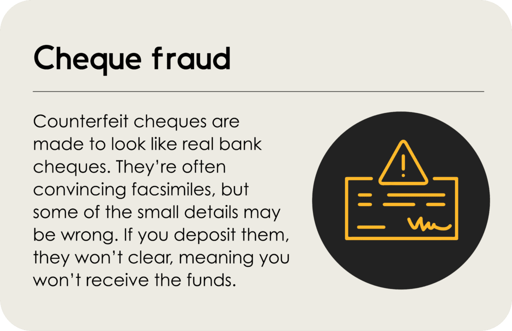 This is an older form of fraud that businesses are unfortunately still dealing with. Cheque fraud comes in a few different forms. Counterfeit cheques are made to look like real bank cheques. Theyโre often convincing facsimiles, but some of the small details may be wrong. If you deposit them, they wonโt clear, meaning you wonโt receive the funds. Forged cheques are legitimate cheques that have been stolen, and are signed by the fraudster rather than the true account holder.