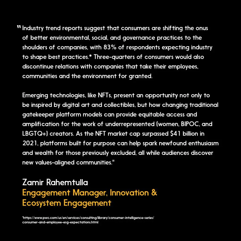 Through a “Minimum Viable Ecosystem” (MVE) approach, we bring together a small subset of partners and with their help, seek to influence, co-create, and expand collective knowledge in emerging trends, then share that knowledge and any outputs to relevant stakeholders. By doing this, we encourage greater collaboration across sectors and among partners towards a common solution: to grow strategic networks and create a stronger pan-Canadian innovation sector. The task is monumental, but we’re cautiously optimistic that with the right amount grit and collaboration, we can all rise to the task of providing a more accessible, and diverse set of products and services for all people and small businesses in Canada.