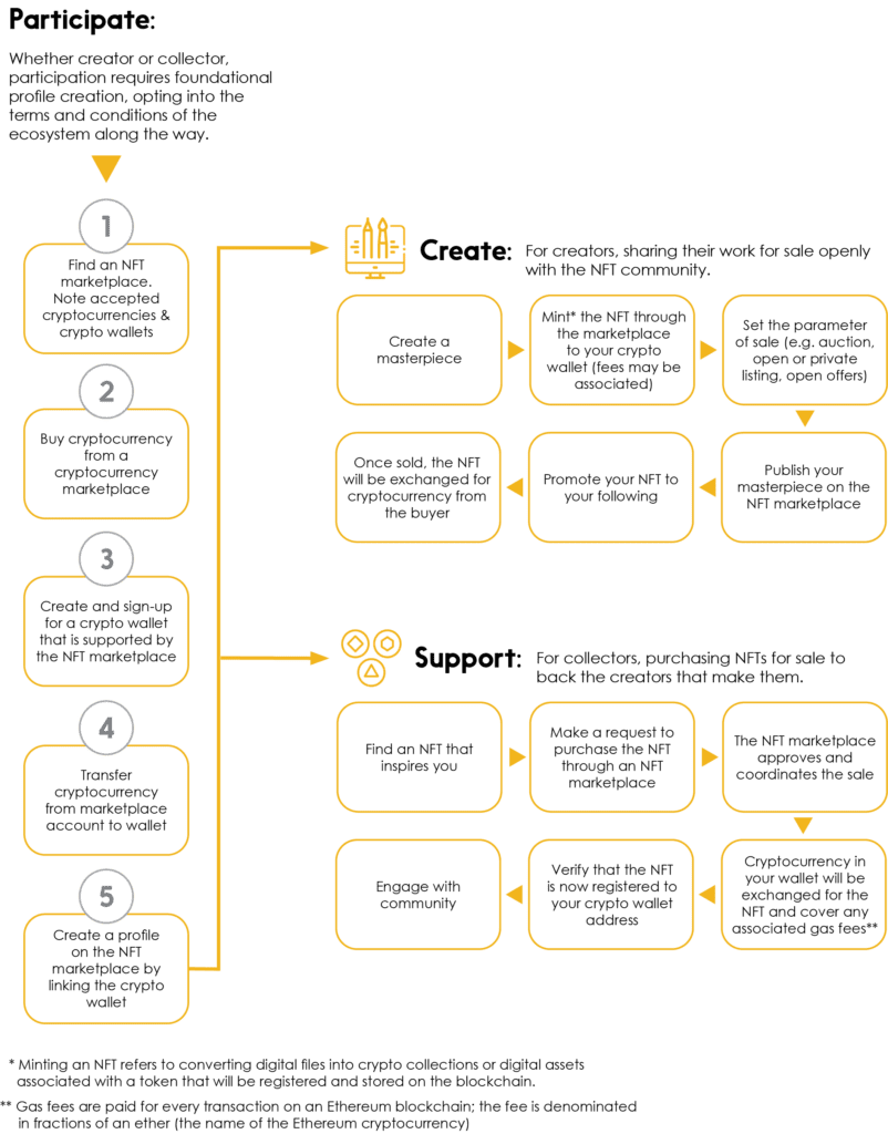 Though the user experience may differ between the multitude of NFT platforms and options, the following aims to capture the most typical activities required.