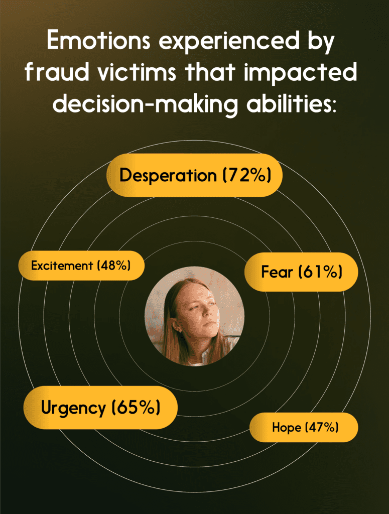 Before falling victim to fraud, some survey respondents reported experiencing negative emotions, such as feeling anxious, concerned, or stressed. And the majority of those who reported feeling anxious (61 per cent) or stressed (55 percent) said those emotions had a direct impact on their decision-making ability. At the same time, nearly half of the respondents said they experienced positive emotions, like excitement and hope, in connection to the fraud attempt. The fact is that emotions — positive and negative — have the potential to impair rational thinking, clouding judgment and leading to impulsive actions.