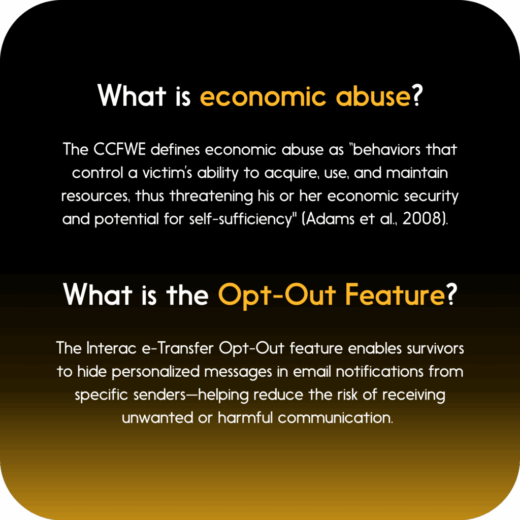 By enabling the Interac e-Transfer Opt-Out feature, survivors of economic abuse can shield themselves from potentially harmful or unwanted messages – without affecting their ability to send or receive money.
