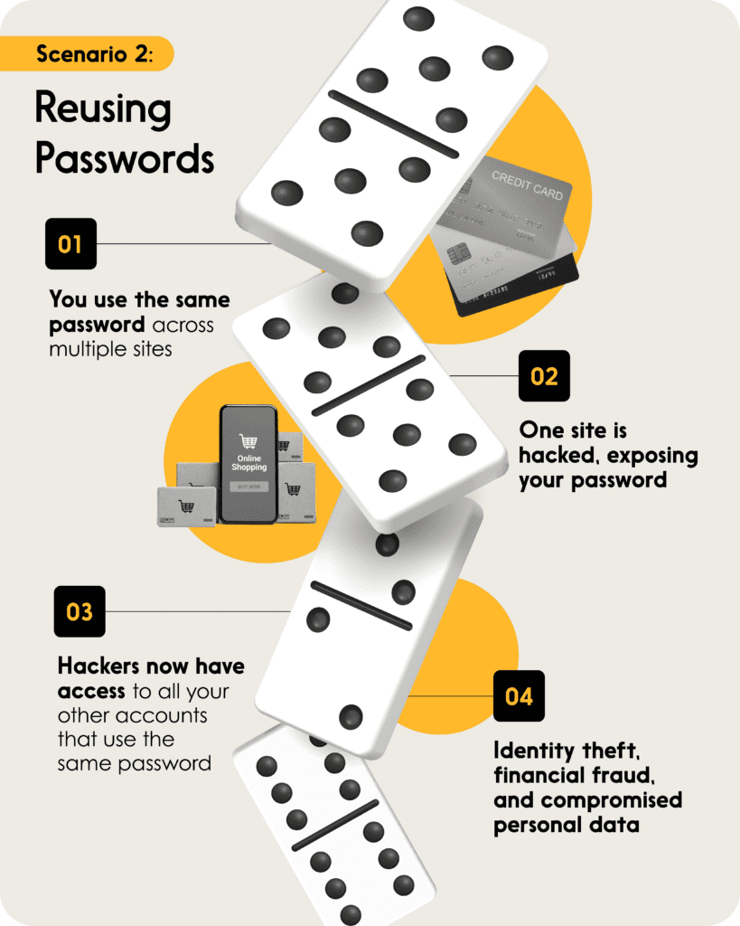 It’s like a row of dominoes, each knocking over the next as it falls. For you, it’s a chain reaction of trouble. Doesn’t that sound like something you’d like to avoid? Then check out the scenarios below to see how not being careful around our little digital security habits can lead to big problems down the road — like a chain of falling dominoes.
