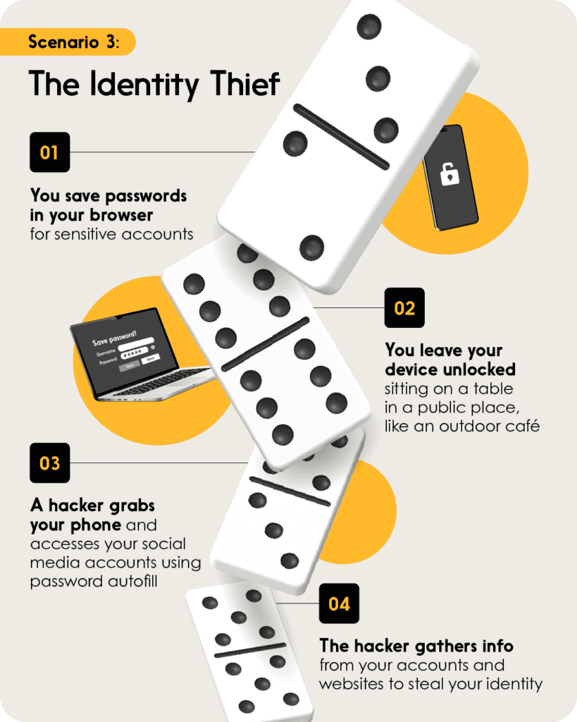 Storing passwords in your browser might save you time in the short term, but it can also make it easier for a hacker to gain access to your sensitive accounts. (This is why you should use a password manager or another safe method for keeping track of your passwords.) This scenario imagines what happens if you make it easy for someone to not only access your device, but your accounts too. You’re sitting at an outdoor café when a hacker snatches your phone. And because your accounts are easy to access, the hacker could learn your date of birth, home address and even social insurance number. You’ve accidentally given him/her an identity theft starter pack!
