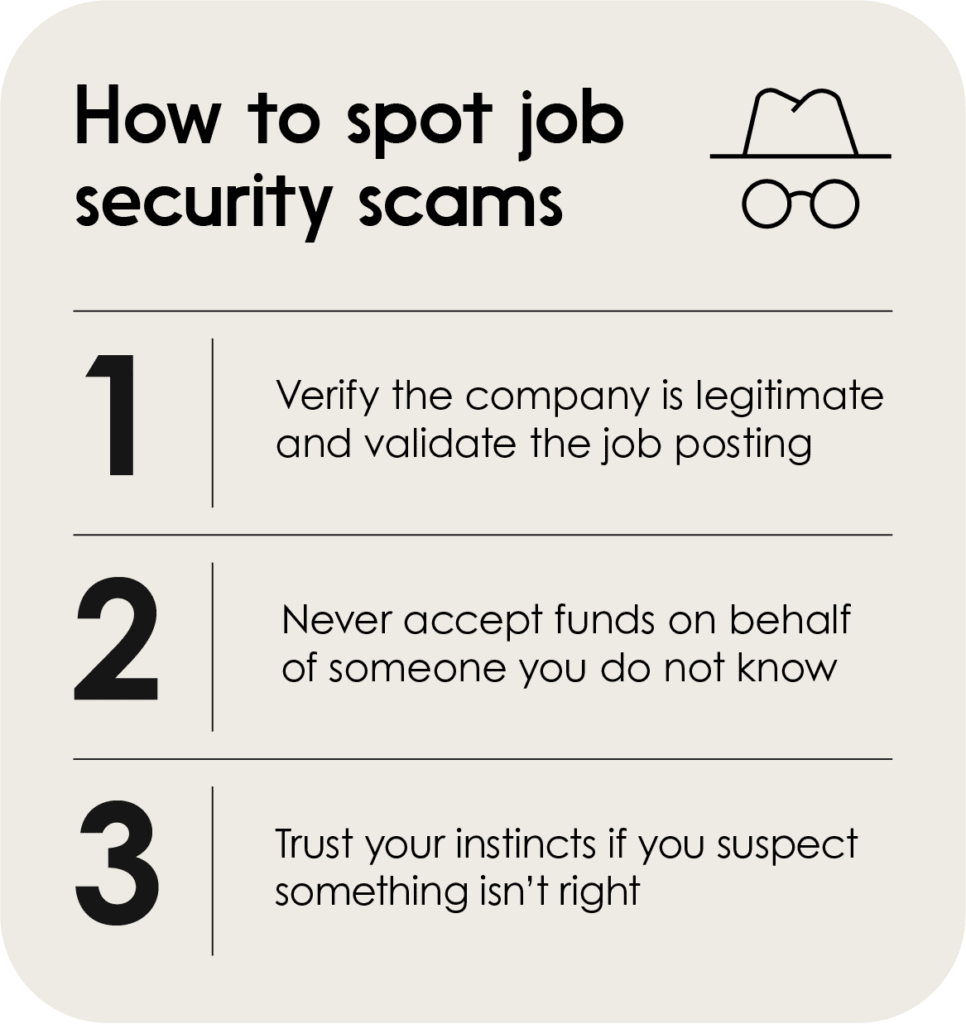 And remember: A legitimate employer will not ask you to pay them. Nor will they ask you to accept money and then send it to someone else.