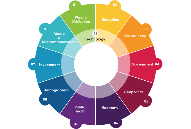 It might seem like there is no way to make sense of a world with so many moving parts and dependencies. However, research on global disruption found that there are 11 macro forces at play: wealth distribution, education, infrastructure, government, geopolitics, economy, public health, demographics, environment, media & telecommunications, all with an underpinning of technology and technological change. For Interac, all 11 have equal importance and should be analyzed holistically.