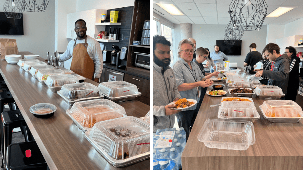 For Black History Month, I helped lead a lunch for all the employees in our Ottawa office. Since they were unfamiliar with African dishes and never tried it, I recommended Suya Palace, a local Black owned African restaurant in Ottawa, which I also recommend to anyone looking for a great meal. I worked with the restaurant to help create a customized menu for everyone to experience – we had smoked Jollof rice, Chicken and Beef Suya, Plantains and their House Salad. There were a lot of people smiling at me by the end of lunch!