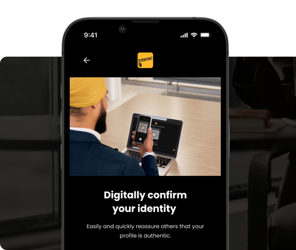 Invite users to obtain and share an Interac Verified reusable credential. They’ll verify their identity by logging into their online banking account at a participating financial institution2, then confirm their identity by uploading an accepted government-issued document photo and a live selfie.