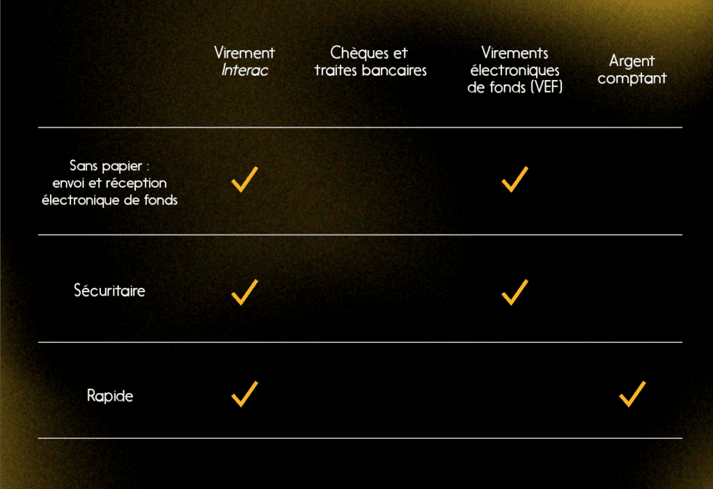 Pourquoi votre entreprise devrait-elle adopter Virement Interac, plutôt que d’utiliser des méthodes traditionnelles comme l’argent comptant, les chèques et les virements électroniques de fonds (VEF)? Parce que ces dernières sont souvent fastidieuses, gruge-temps et lentes et, pour ces raisons, elles risquent d’être peu optimales pour suivre le rythme de vos activités commerciales.
