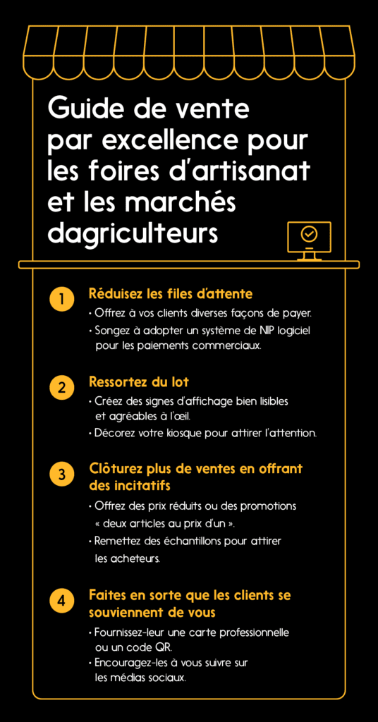 Rappelez-vous que vous ne vous contentez pas de réaliser des ventes, mais que vous fidélisez des clients. Ainsi, chaque marché auquel vous participez représente une occasion de bâtir une clientèle. Que les gens effectuent un achat ou non, offrez-leur quelque chose qui les aidera à se souvenir de vous — et des moyens d’effectuer des achats plus tard. Pour savoir comment rédiger un bon argumentaire de vente (et plus), consultez la trousse à outils destinée aux PME.