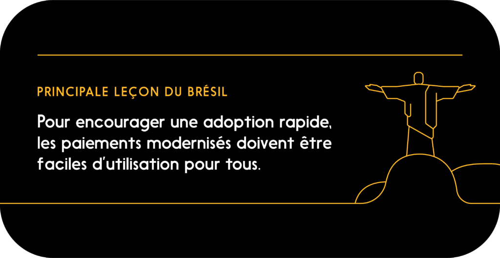 Qu’est-ce qui explique la réussite de la banque centrale du Brésil à ce chapitre? Entre autres, celle-ci a fait de l’inclusivité (c’est-à-dire une inclusion financière accrue) l’un des principes directeurs clés de l’établissement de ce système. L’initiative a été couronnée de succès, en partie, en raison du fait que l’expérience des utilisateurs a, selon des observateurs, été positive dès le début.