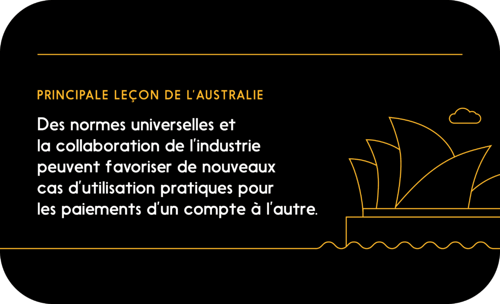 L’Australie, pays qui s’apparente au Canada à de nombreux égards, a adopté sa nouvelle plateforme de paiements (NPP) en 2018. À l’instar des autres initiatives de modernisation des paiements décrites dans cet article, le NPP a connu un franc succès. En effet, selon un récent rapport du gouvernement australien, elle a traité plus d’un milliard de transactions au cours d’une période de 12 mois terminée en 2022, ce qui représente plus d’un quart de toutes les transactions d’un compte à un autre (indicateur clé, compte tenu de l’objectif du gouvernement d’éliminer graduellement les chèques).