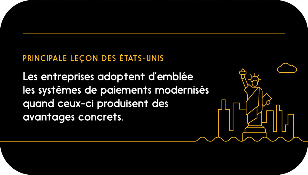 Prenons les États-Unis. Selon un sondage que US Bank a réalisé en 2023 auprès de chefs d’entreprise, l’adoption de paiements en temps réel dans plusieurs secteurs (vente au détail, voyages, tourisme d’accueil et soins de santé) a largement découlé du désir de renforcer le service à la clientèle, d’améliorer les flux de trésorerie et de permettre des rapprochements instantanés. La modernisation des paiements peut aussi remédier à certains irritants. Par exemple, au sein des petites et des moyennes entreprises américaines, une étude de PYMNTS a révélé une divergence entre leurs acheteurs (dont 38 pour cent ont tendance à payer par chèque ou par ACH, version américaine des VEF) et leurs fournisseurs, qui préféreraient des méthodes plus rapides.