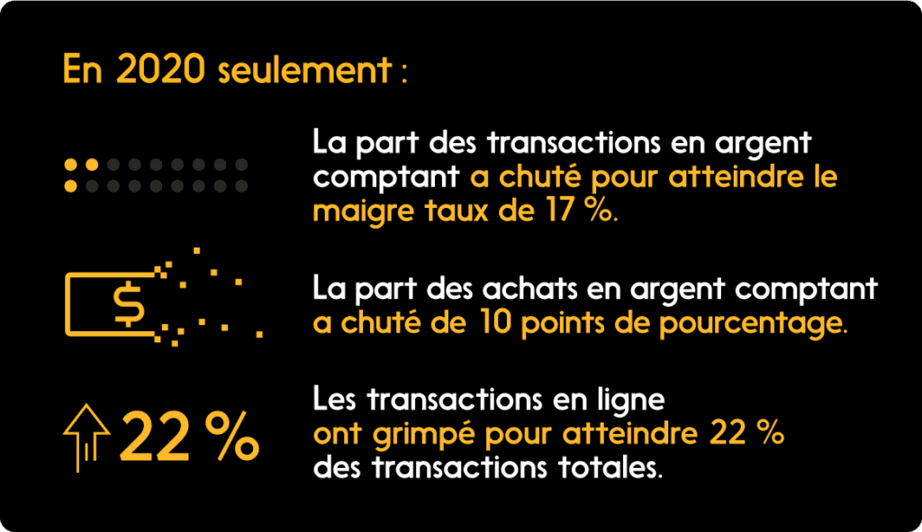 La pandémie a transformé la façon de faire des achats. Elle a non seulement accéléré la mise en œuvre d’innovations numériques, mais aussi le virage vers une société sans argent comptant. Les consommateurs canadiens ont modifié leurs habitudes de magasinage et de paiement, délaissant les transactions en personne en faveur du commerce électronique. Et ils n’ont pas l’intention de revenir en arrière.