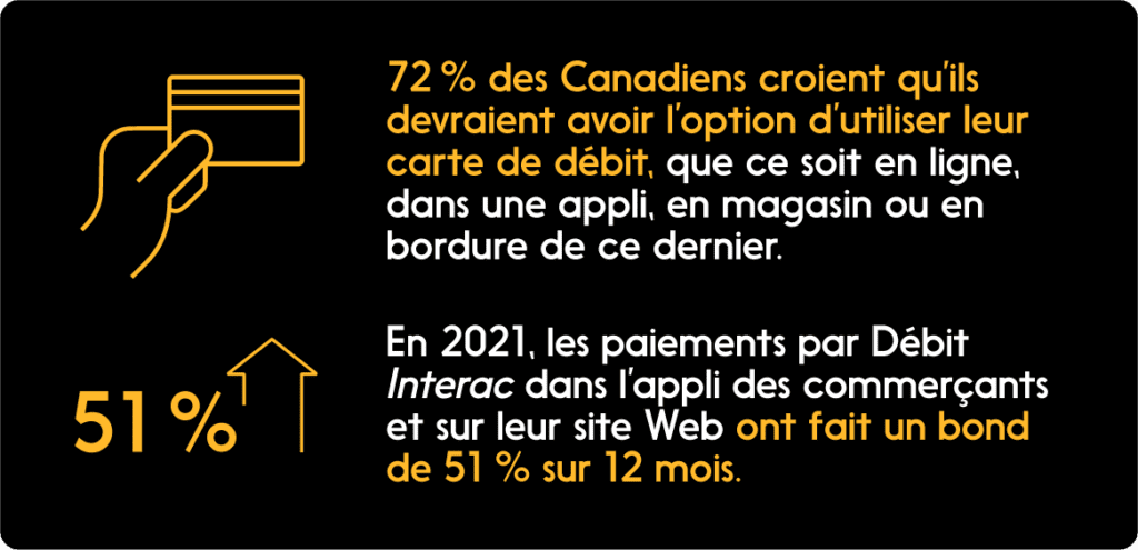 Bien que le commerce en ligne ait antérieurement mis l’accès sur le crédit, la demande d’utiliser le débit est en plein essor. Les Canadiens souhaitent avoir des choix en matière de paiements et croient qu’ils devraient avoir l’option d’utiliser leur carte de débit en ligne. Nous en constatons la preuve dans le volume de nos transactions.