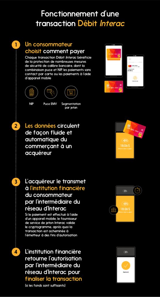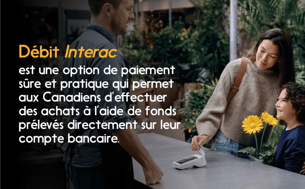Débit Interac fait partie de la vie quotidienne des Canadiens d’un bout à l’autre du pays, leur ayant permis de réaliser 6,6 milliards de transactions par débit en 2023. Ce service offre aux entreprises et aux consommateurs une façon sûre, fiable et pratique de payer. C’est d’ailleurs l’une des raisons pour lesquelles près d’un demi-million de commerçants du pays mettent à profit les avantages d’offrir Débit Interac, tels que des frais bas, qui font fi des tracas.