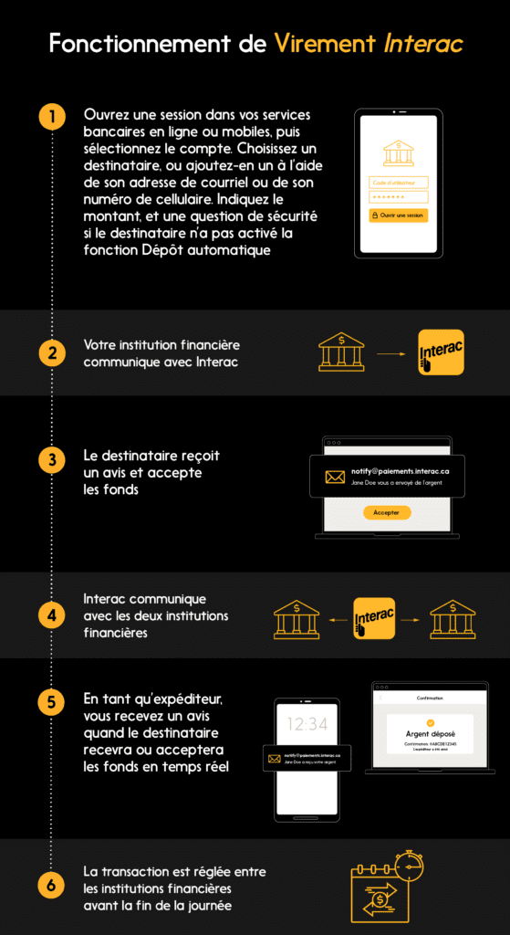 - Virement Interac, qui permet l’échange de fonds entre des comptes bancaires canadiens en ligne