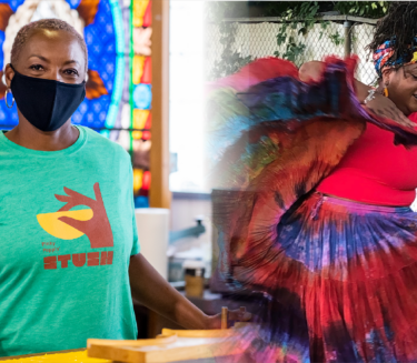 A woman wearing an ochre-coloured apron uses a laptop in a small business workshop.