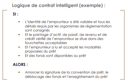 Les contrats intelligents programmables au cœur de la FiDé sont des combinaisons de règles du type « Si les conditions sont remplies, alors faites cette action ». Pour un rôle de souscripteur de prêts, une logique de contrat intelligente pourrait ressembler à l’exemple ci-dessous.