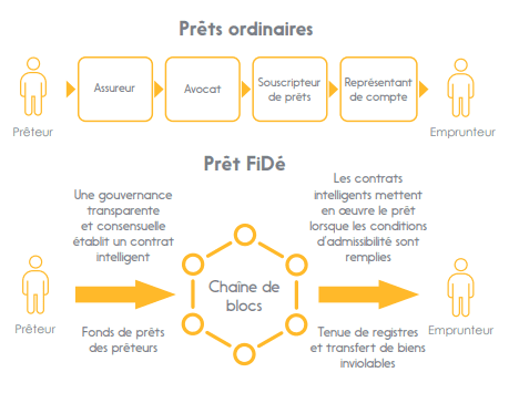Voici un exemple simplifié de la différence sur un processus de prêt. Le processus de prêt ordinaire fait généralement appel à plusieurs personnes (peut-être dans plusieurs organisations) pour gérer tous les papiers, faire les vérifications et l’équilibre, et implique la responsabilité personnelle pour faire en sorte que le système soit fiable. Cependant, des pans importants de ce processus (y compris la partie relative à la confiance) peuvent être automatisés par la FiDé.