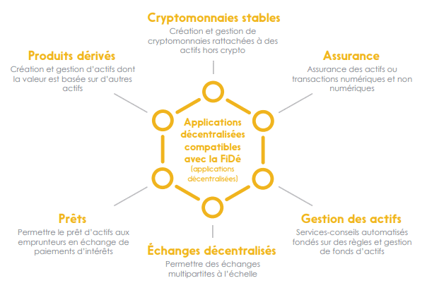 La finance décentralisée (FiDé) est une catégorie d’applications hautement automatisées et décentralisées de services financiers déployés sur une chaîne de blocs ouverte et programmable. Ces applications décentralisées visent à remplacer les processus financiers traditionnels, lents et parfois opaques, qui exigent beaucoup de personnel par une automatisation plus transparente, efficace et fondée sur des règles, tout en préservant la confiance essentielle dont les parties ont besoin pour se sentir à l’aise.