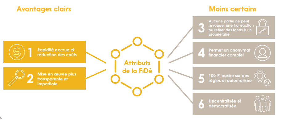 La FiDé diffère des autres approches d’automatisation dans sa capacité de transférer une plus grande part de la confiance requise sur la conception du système, plutôt que sur les individus ou les organisations qui l’exploitent grâce au fonctionnement des chaînes de blocs.