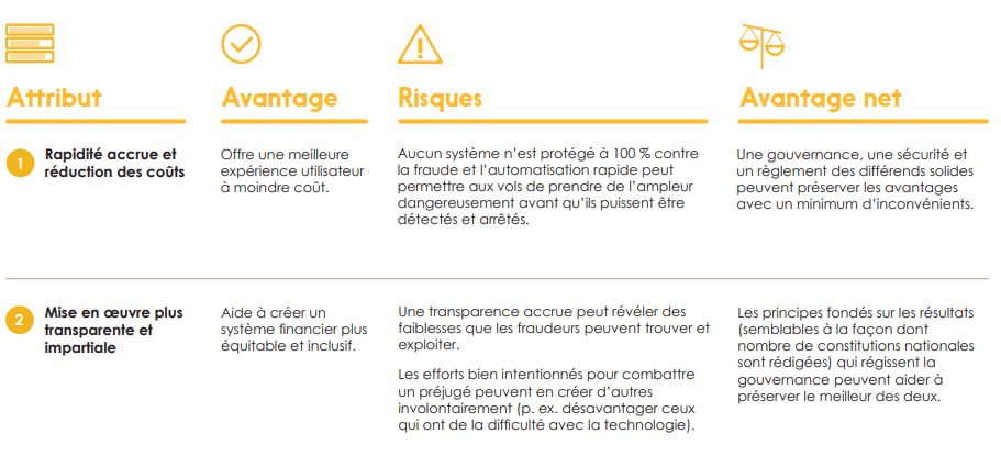 Il y a certains avantages qui présentent clairement des possibilités d’amélioration par rapport aux approches existantes; dans ces cas, ces avantages ouvrent des possibilités pour de nouveaux cas d’utilisation, produits et services. Par exemple, le déblocage d’un accès en temps réel et à faible coût à la solvabilité des clients potentiels a ouvert la voie au crédit en temps réel, comme l’achat à tempérament (« achetez maintenant et payez plus tard »).