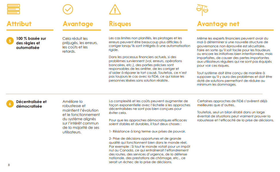 Les bailleurs de fonds de FiDé la considèrent comme un outil puissant pour rendre le système financier d’aujourd’hui beaucoup moins coûteux, plus rapide, plus équitable et plus fiable. D’autres y voient un mirage, ou pire, une pyramide de Ponzi. Ce rapport Tendances explore le concept de FiDé et ses implications (d’un point de vue canadien) – ce qu’il est, comment il est utilisé – et cherche à séparer les avantages clairs des allégations plus douteuses. Malgré ses difficultés en 2022, la technologie offre plusieurs facteurs de valeur crédibles qui, s’ils sont bien mis en œuvre, pourraient améliorer le secteur financier pour toutes les parties prenantes.