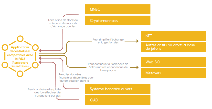 Remarque : Bien que la plupart des applications de FiDé utilisent de nos jours la cryptomonnaie pour échanger de la valeur, la monnaie numérique hors crypto (monnaie fiduciaire) peut aussi fonctionner. La principale exigence est que les transferts de fonds puissent être déclenchés automatiquement par un de contrats intelligents (une fois qu’on leur a donné lesautorisations appropriées). La FiDé n’est pas non plus une finance intégrée. C’est-à-dire lorsqu’une institution financière permet à d’autres organisations d’intégrer ses produits dans leur propre offre (p. ex., au moyen d’une API ou d’un SDK). Par exemple, un fournisseur d’achat à tempérament vous donne instantanément l’autorisation de crédit sur le site Web du commerçant. Vous ne quittez jamais le site du commerçant, mais vous êtes en mesure d’obtenir ce financement d’une tierce partie directement dans le processus de paiement du commerçant.