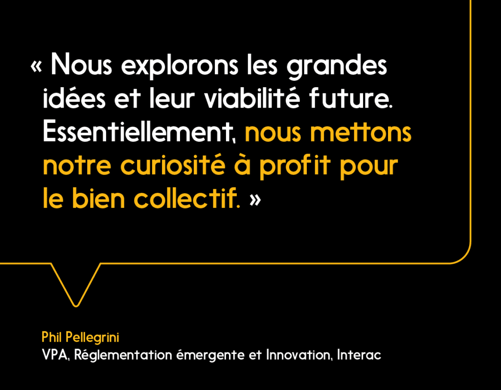 « Nous explorons les grandes idées et leur viabilité future », explique Phil Pellegrini, vice-président adjoint, Réglementation émergente et Innovation chez Interac. « Ensuite, nous transmettons ce que nous avons appris à l’organisation, aux Canadiens et à d’autres intervenants de la fintech pour qu’ils sachent à quoi s’attendre. Essentiellement, nous mettons notre curiosité à profit pour le bien collectif. »