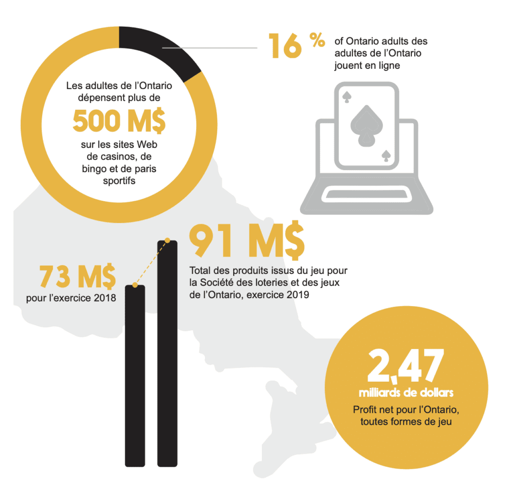 Au Canada, la loterie et le jeu ont évolué au cours des dernières décennies, passant d’une source de divertissement télévisé hebdomadaire relativement mineure et plaisante à un secteur important qui emploie des milliers de personnes et qui rapporte plus de 9 milliards de dollars par année aux gouvernements provinciaux. En 2017, Les Canadiens ont dépensé 17,1 milliards de dollars pour des jeux parrainés par le gouvernement et des services connexes (p. ex., restauration et hébergement), ce volume ne représentant qu’un sous-ensemble du marché mondial du jeu, qui devrait atteindre des revenus annuels de 565 milliards de dollars américains d’ici la fin de 2022.