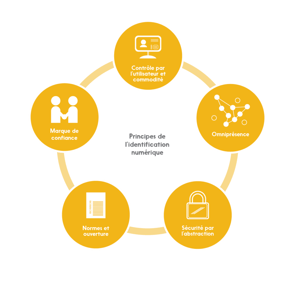 Il est facile de discuter de l’identification numérique de manière théorique, mais il est beaucoup plus complexe de concevoir une architecture et de mettre en œuvre un système d’identification numérique complet, sécuritaire et durable. Pour ce faire, il faut suivre un ensemble de principes clairement définis. Selon nous, cinq principes sont essentiels :