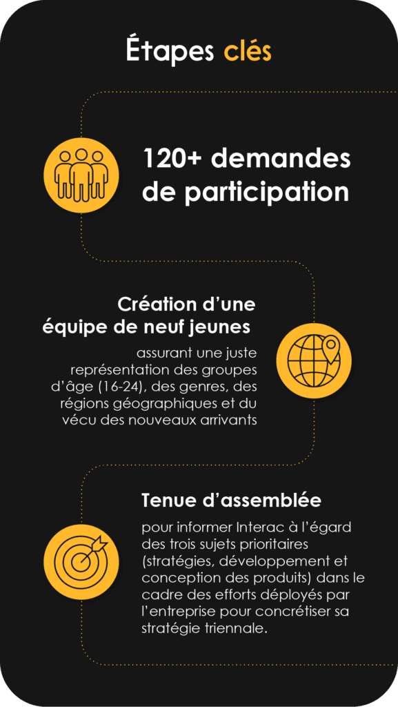 Pour Interac, la création du Conseil des jeunes a représenté une occasion de tenir des discussions qui influencent directement les stratégies et les prises de décisions. Les leçons tirées de chaque assemblée se traduiront directement en actions réalisables, accordant à Interac la flexibilité de concevoir, de construire et de valider de nouvelles initiatives, du début à la fin, aux côtés d’un groupe diversifié de personnes.