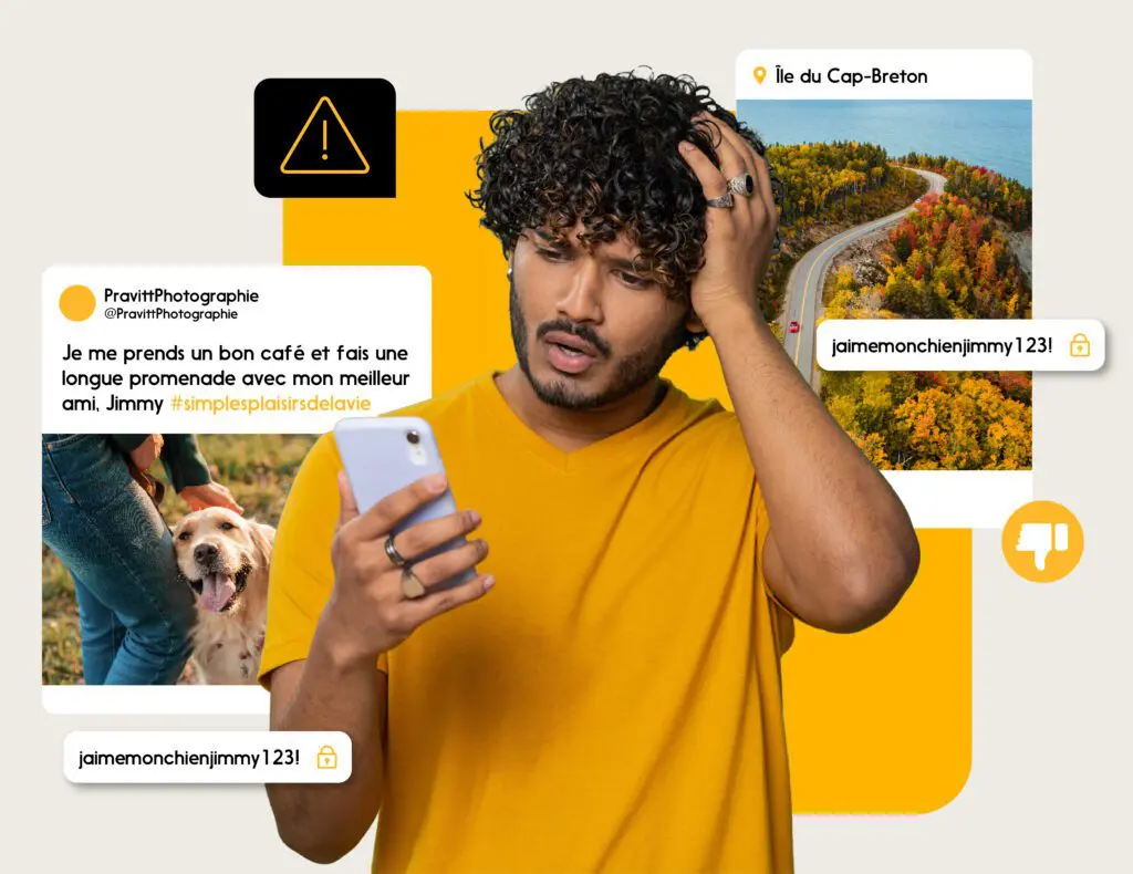 Comme nous passons beaucoup de temps en ligne, que ce soit pour le travail ou les loisirs, nous sommes constamment en contact avec d’autres personnes. Bien que, souvent, nos comportements ne semblent pas dangereux au moment même, le contenu que nous publions et que nous partageons en ligne au fil du temps peut être utilisé pour mettre au jour notre identité et les façons de nous joindre. Plus de la moitié des répondants à un sondage réalisé par Interac en 2022 affirment avoir subi au moins une tentative de fraude par semaine, et près de quatre Canadiens sur dix déclarent que le fraudeur avait utilisé leurs renseignements personnels, comme leur nom au complet (61 pour cent), leur adresse (27 pour cent) et leur date de naissance (12 pour cent), afin de se faire passer pour une source fiable.