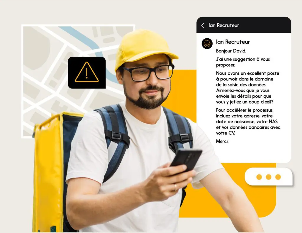J’ai contacté le recruteur pour lui confirmer mon intérêt. Celui-ci a envoyé mes renseignements à un « préposé aux RH », qui m’a posé par texto des questions sur mon expérience, mes compétences, mes connaissances techniques et autres. Tout cela a pris environ une heure, mais j’ai répondu à toutes les questions, et le préposé semblait chaleureux et sympathique. C’est là qu’il a commencé à me demander des renseignements plus personnels, comme mon adresse, ma date de naissance, mon NAS et mes données bancaires. J’ai trouvé cela bizarre vu que le poste n’était pas encore confirmé. Quand j’ai demandé au préposé si j’étais engagé, il m’a répondu que je devais d’abord répondre aux questions. C’était la façon de procéder au Canada. Comme cela me semblait louche, j’ai arrêté de répondre aux questions. »