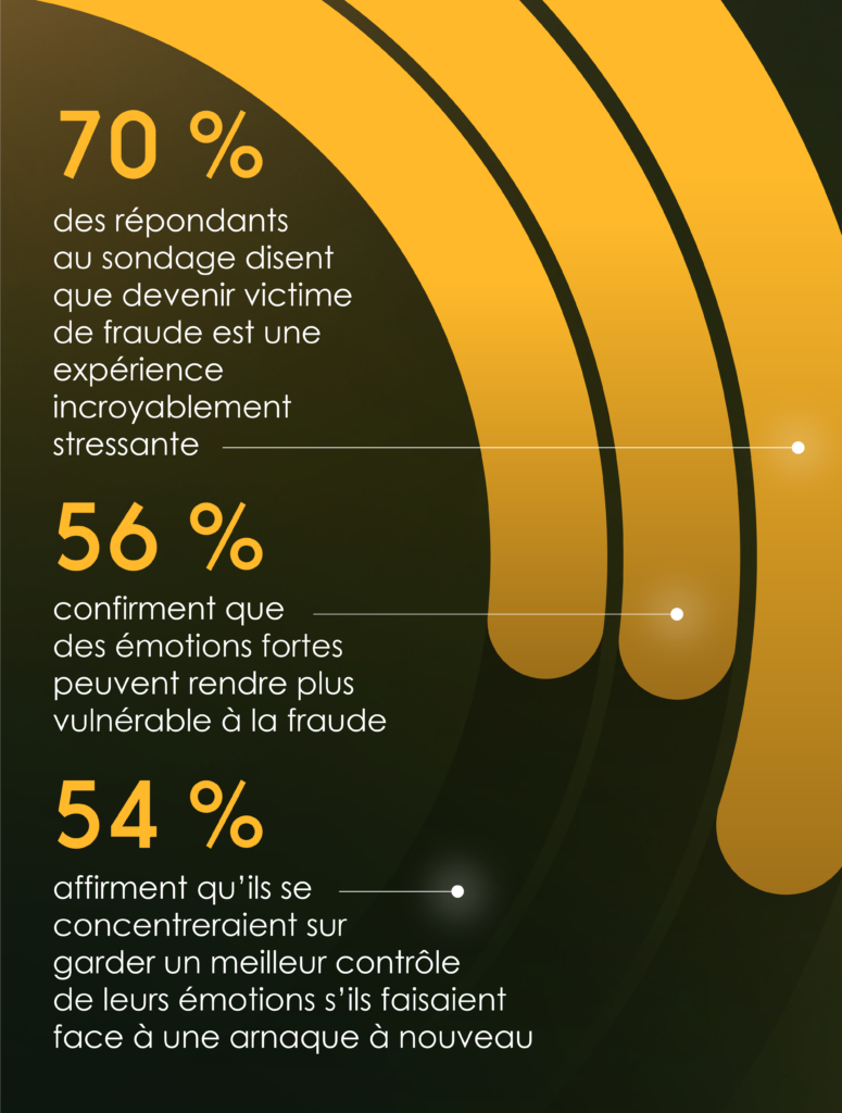 Personne n’est à l’abri de devenir victime de fraude, et le fait d’être victime d’une escroquerie n’est pas le reflet de l’intelligence. Au contraire, les fraudeurs n’essaient pas d’être plus rusés que nous. Ils tentent plutôt d’exploiter nos émotions humaines universelles : notre peur, notre enthousiasme, notre espoir, notre solitude. C’est ce qu’ont constaté la plupart des victimes canadiennes de fraude interrogées : 75 % d’entre elles ont déclaré qu’il est important de gérer ses émotions lors d’une tentative de fraude.