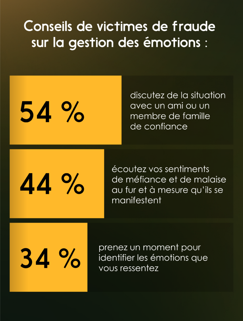 Plus de la moitié (54 %) des victimes de fraude interrogées sont d’accord que, en sachant ce qu’ils savent maintenant, ils se concentreraient sur reprendre le contrôle de leurs émotions s’ils faisaient face à une tentative de fraude dans le futur.