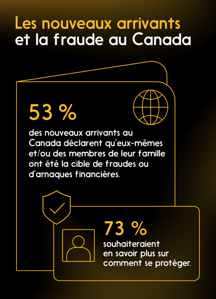 Si vous êtes un nouvel arrivant qui se sent dépassé par le manque de confiance financière au Canada, vous n’êtes pas seul. Selon un récent sondage Interac, 44 % des nouveaux arrivants au Canada partagent ce sentiment. La peur de la fraude est l’une des principales raisons pour lesquelles de nombreuses personnes manquent de confiance. La majorité (53 %) déclarent qu’eux-mêmes et/ou des membres de leur famille ont été la cible de fraudes ou d’arnaques financières. Et 73 % d’entre eux aimeraient en savoir plus sur comment de se protéger des fraudes.