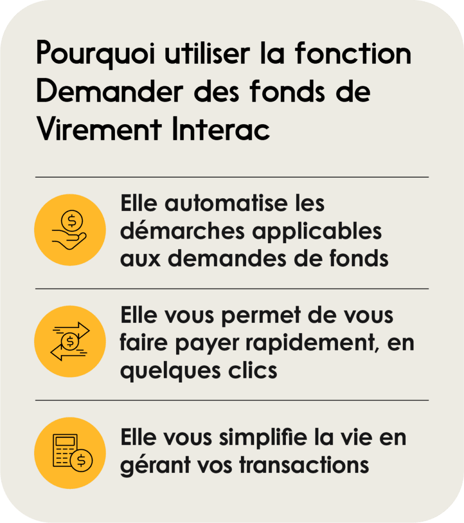 Voici trois raisons de faire appel ร la fonction Demander des fonds de Virement Interac, ainsi quโune description des รฉtapes pratiques pour la mettre en place et constater de vous-mรชme sa facilitรฉ dโutilisation.
